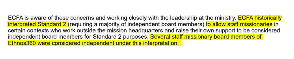 I've heard murmurs that ECFA does not do a great job of ensuring members are meeting their guidelines but just takes the organization's word for it. I decided to reach out to ECFA asking about this seemingly unearned accreditation. I presented the information regarding Ethnos360's board composition, and to my surprise, ECFA was fully aware that Ethnos360's board is not in compliance with Standard 2. What I learned is that ECFA creatively "interprets" its guidelines until they are unrecognizable.