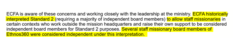 This would lead us to believe that ECFA finds this standard important and surely wouldn't accept a member who didn't meet this standard, but that doesn't seem to be the case. A majority of Ethnos360's board members are not independent, and, in fact, according to Ethnos Truth Project, such board composition would violate Ethnos360's bylaws.