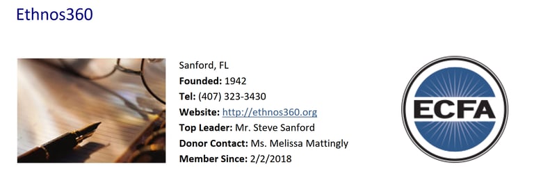According to its ECFA profile, Ethnos360 has been an ECFA member since 2018. ECFA proclaims its purpose is "enhancing trust in ministries and churches." This goal is admirable and much needed in today's world, but does ECFA's accreditation of Ethnos360 enhance trust?