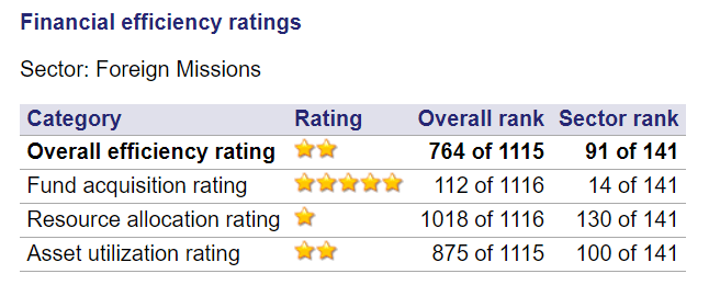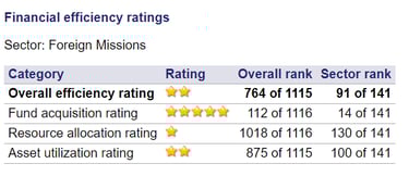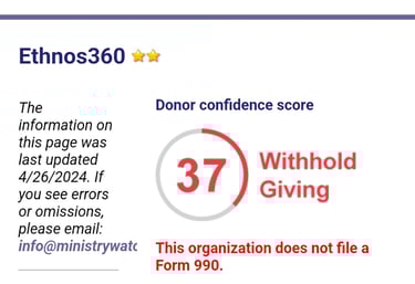 Today's Ethnos360 scores on Ministry Watch tell a different story. They now have 2 stars, a 37 donor confidence score, and their transparency grade is D. Why is that? Ministry Watch lays out some of the criteria included in their calculation. Some of these factors are 2 stars in overall efficiency and asset utilization and 1 star for resource allocation.