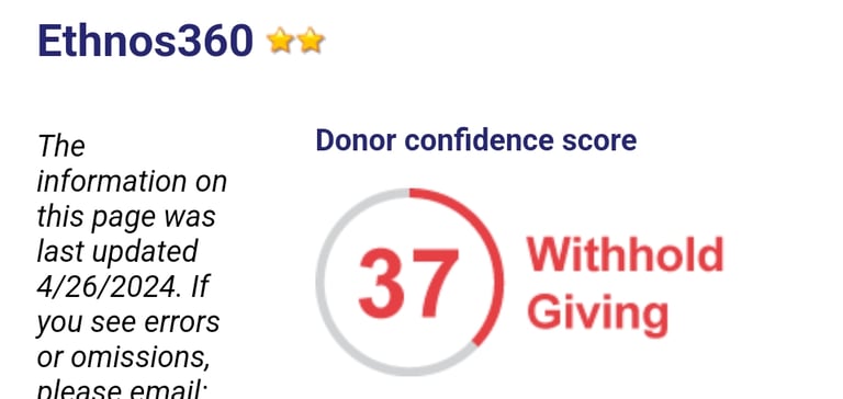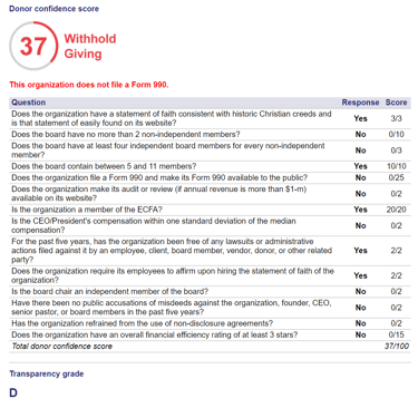 The criteria for the donor confidence score explains how Ethnos360 ended up with 37/100. This includes lack of an independent board, failure to file a Form 990, public accusations of misdeeds, and use of NDAs.