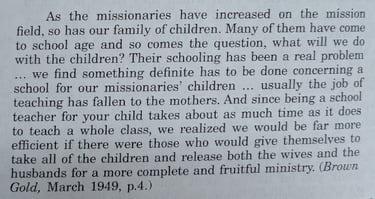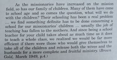 There's a long history of children being considered a problem in missions. There are the stories of early missionaries who set out without their children, abandoning them to do their work. This video from the 1950s talks about missionary kids being neglected and the necessity of a school to send them to since their parents couldn't care for them. In "The Story of New Tribes Mission," Paul Fleming, founder of New Tribes Mission, now Ethnos360, is quoted, "...what will we do with the children? Their schooling has been a real problem..."