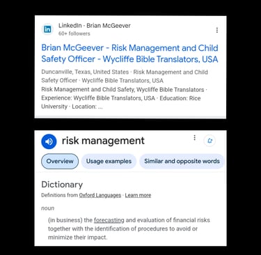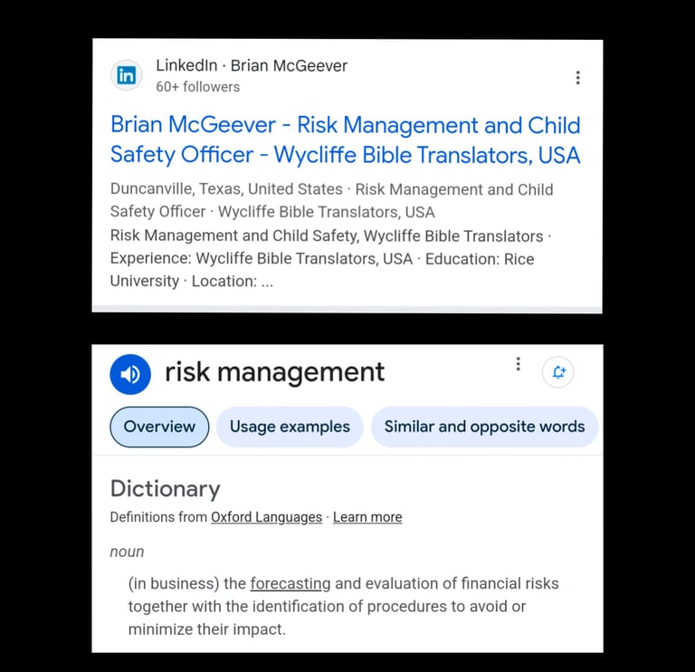 I don't think people outside missions fully understand the detrimental way MKs are often viewed in the missions community, as a liability to the efficiency and effectiveness of the all-important task. This isn't just Ethnos360. I stumbled upon this job title for Wycliffe, Risk Management and Child Safety Officer. The title seems to be saying the quiet part out loud. There's no obvious assumption that children are precious and vulnerable and worthy of protection. Child safety is lumped in with risk management, which Oxford describes as, "forecasting and evaluation of financial risks together with the identification of procedures to avoid or minimize their impact." That would imply child safety isn't about MKs' actual safety and ability to flourish but about mitigating the potential financial risk for the institution.