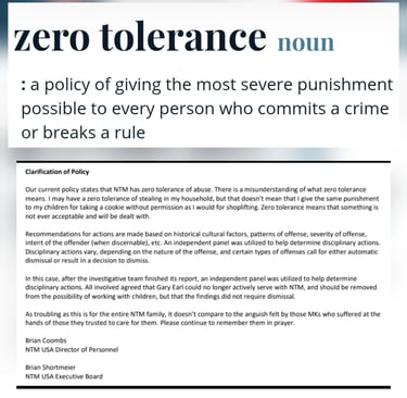 What does zero tolerance mean? According to Merriam-Webster, it means "a policy of giving the most severe punishment possible to every person who commits a crime or breaks a rule." Ethnos360/New Tribes Mission frequently uses the term "zero tolerance" to describe its abuse policy. Even a recent email to members responding to how they handled Josh Weeks says, "We maintain a zero-tolerance policy for any form of abuse." This term has been what they use to claim they are strict on abuse for at least a decade.