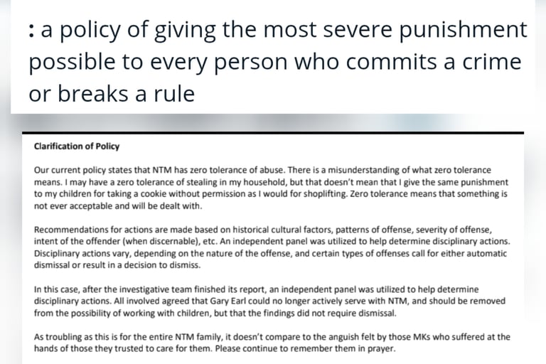 When they were responding to the abuse of Gary Earl, they decided someone who abused multiple children could retire, which would allow him to continue to receive funding through Ethnos360 and thus be able to represent himself as a retired missionary. Does retirement seem like the "most severe punishment"? It didn't seem like it to many missionaries at the time. When missionaries attempted to hold leadership accountable for their policy, leadership sent an email explaining why some members were just "misunderstanding." According to the email, zero tolerance does not mean what you think it means, what the dictionary definition would lead you to believe. They used an outrageous analogy: a "zero tolerance" policy for stealing doesn't mean you get the same consequence for stealing a cookie as you would for shoplifting. They blamed the "recommendations panel," a convenient scapegoat and process that former panelists claim leadership manipulated so they could control the outcomes, and said they didn't need to follow either their policy or the basic definition of "zero tolerance" and that Gary Earl did not need to be dismissed (although they did eventually adjust the status from retired to resigned).