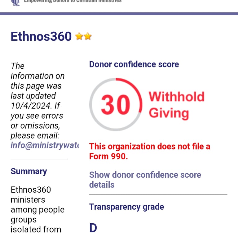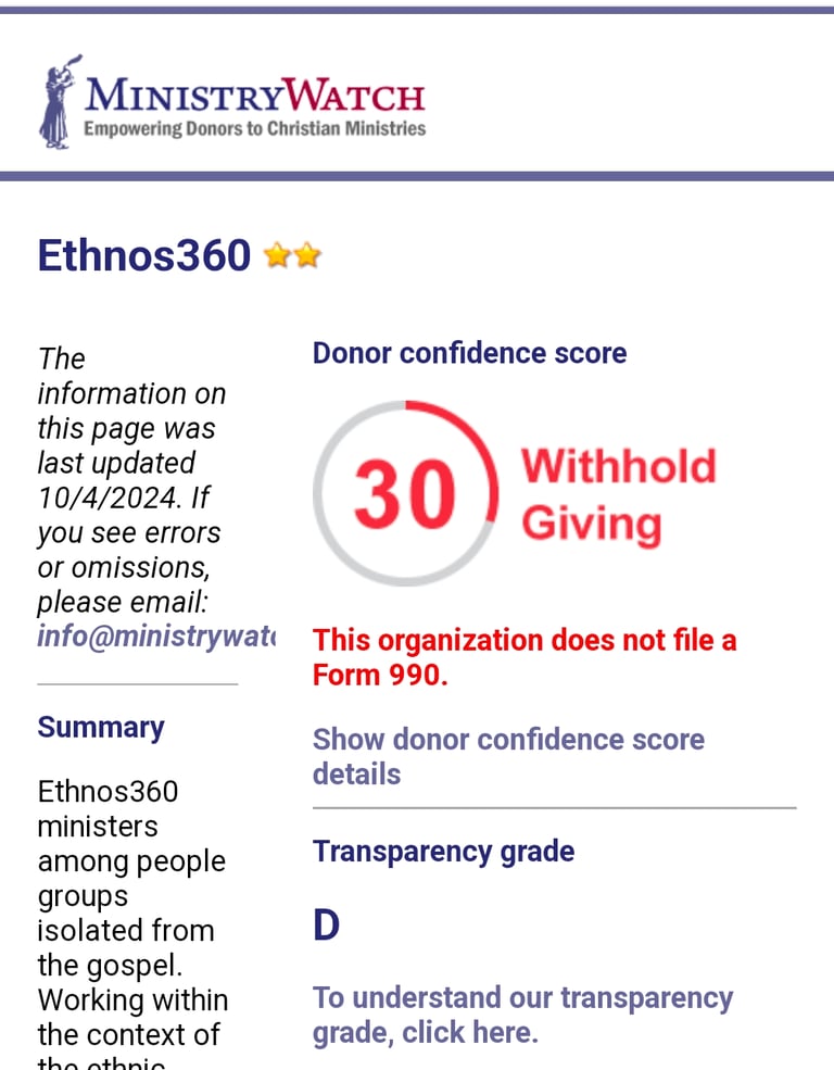 Ministry Watch has reduced Ethnos360's donor confidence score to 30 and continues to recommend donors withhold giving. I have previously discussed Ethnos360's abysmal Ministry Watch score here. The seven-point drop can be attributed to a change in the weighting of the financial efficiency rating and the board size rating as well as two points taken away because they are no longer free of lawsuits within the past five years due to the recent lawsuit. Since twenty of their thirty points continue to be based on Ethnos360's suspect ECFA endorsement/membership, it is reasonable and wise for supporters to reevaluate whether Ethnos360 is a trustworthy place to send money.